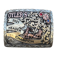 The Ketchum Buckle is a unique shaped silver plated buckle that looks awesome with its beautiful border. This custom trophy buckle has a very unique look, and the custom lettering can be changed to whatever you need. The shimmer of this buckle will catch your eye and is a great way to show off someone’s hard work, achievement, or personalization. This buckle measures 3.5" inches tall by 4.5" inches wide. The back of the buckle has a hook for your belt hole. It also has a swivel bar to attach to your belt.