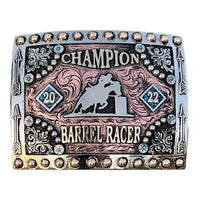 The Sunland Park Buckle is a unique shaped Silver plated buckle that looks awesome with its beautiful Bead and rope border. This custom trophy buckle has a very unique look, and the custom lettering can be changed to whatever you need. The shimmer of this buckle will catch your eye and is a great way to show off someone’s hard work, achievement, or personalization. This buckle measures 3.5" inches tall by 4.5" inches wide. The back of the buckle has a hook for your belt hole. It also has a swivel bar to attach to your belt.