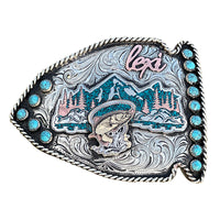 The Lexi Buckle is an antique German silver buckle with a new take on some of the original cowboy belt buckles. This custom  buckle has a very unique look, and the custom brand can be changed to whatever you need. The traditional look of this buckle will catch your eye and is a great way to show off someone’s hard work, achievement, or personalization. This buckle measures 3.5" inches tall by 4.5" inches wide. The back of the buckle has a hook for your belt hole. It also has a swivel bar to attach to your belt.