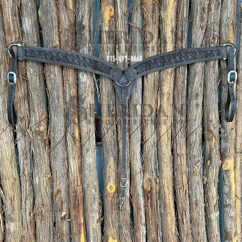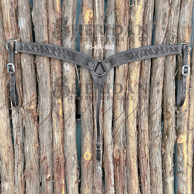 Sheridan provides high quality leather breast collars to finish off your saddle setup. This specific 3-Piece Light Duty Breast Collar is meant to give your horse the support while competing in the arena, light trail rides and other athletic activities while riding your horse. The light duty breast collar is designed out of 3 pieces of contoured leather secured with a round ring in the middle of your horses chest. This allows the leather breast collar to go in front of your horses chest and secure in-between your horses front legs to give your horse a comfortable and secure brace along his chest to help him while he is performing. This breast collar has 3 connections to your saddle to ensure a good secure fit to any horse. We manufacture breast collars to match our Sheridan Saddles, which will make you and your horse ready to ride while matching your saddle tooling and setup as well. Each Sheridan breast collar is handmade and hand tooled to match your saddle with the same quality craftsmanship you have been used to. We can match the tooling of your Sheridan Saddle, add custom lettering, add trophy lettering to any of our breast collars.
