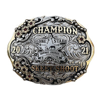 The Lonestar Buckle is a unique shaped silver plated buckle that looks awesome with its accents. This custom buckle has a very unique look, and the custom lettering can be changed to whatever you need. The shimmer of this buckle will catch your eye and is a great way to show off someone’s hard work, achievement, or personalization. This buckle measures 3.5" inches tall by 4.5" inches wide. The back of the buckle has a hook for your belt hole. It also has a swivel bar to attach to your belt.