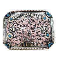 The Luna Buckle is a square silver plated buckle that looks awesome with its Crushed Turquoise Stones . This custom buckle has a very unique look, and the custom lettering can be changed to whatever you need. The shimmer of this buckle will catch your eye and is a great way to show off someone’s hard work, achievement, or personalization. This buckle measures 3.5" inches tall by 4.5" inches wide. The back of the buckle has a hook for your belt hole. It also has a swivel bar to attach to your belt.