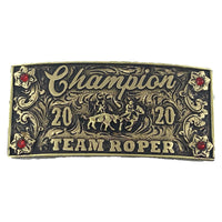 Belt buckles are a great way to advertise or show an achievement, or to personalize one for yourself. This buckle is only an example of how this buckle looks. Your buckle will be made to your specifications, lettering, stone color, etc. For example, if you see a team roper as a figurine and you would like a barrel racer, this will be changed to fit your needs. That goes for the lettering also; whatever lettering you see on the buckle is just an example and will be changed to the lettering you want.