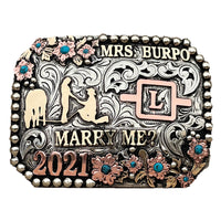 The Marriage Proposal Buckle is a unique shaped silver plated buckle that looks awesome with its design. Not only for the looks but it is a great idea to use to pop the question. Will you marry me? We hope she says yes or she said yes. This custom buckle has a very unique look, and the custom lettering can be changed to whatever you need. The shimmer of this buckle will catch your eye and is a great way to show off someone’s hard work, achievement, or personalization. This buckle measures 3.5" inches tall by 4.5" inches wide. The back of the buckle has a hook for your belt hole. It also has a swivel bar to attach to your belt.