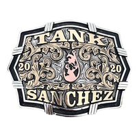 The Memphis trophy belt buckle is a square antique gold plated buckle designed to fit a belt perfect. This custom trophy buckle has a very unique look, and the custom lettering can be changed to whatever you need. The border on the this buckle will catch your eye and is a great way to show off someone’s hard work, achievement, or personalization. This buckle measures 3.5" inches tall by 4.5" inches wide. The back of the buckle has a hook for your belt hole. It also has a swivel bar to attach to your belt.