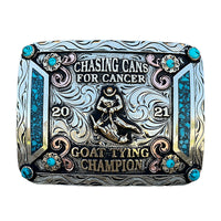 The Mission trophy belt buckle is based around our signature "Crushed Turquoise" stone design. This crushed turquoise buckle looks great on your belt. The stone colors can be changed out to other colors if you would like, just tell us in our buckle customization form. The custom lettering can be changed to whatever you need as well. The design of this buckle is an eye catcher and is a great way to show off someone’s hard work, achievement, or personalization. This buckle measures 3" inches tall by 4.5" inches wide. The back of the buckle has a hook for your belt hole. It also has a swivel bar to attach to your belt.