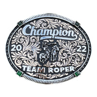 Belt buckles are a great way to advertise or show an achievement, or to personalize one for yourself. This buckle is only an example of how this buckle looks. Your buckle will be made to your specifications, lettering, stone color, etc. For example, if you see a team roper as a figurine and you would like a barrel racer, this will be changed to fit your needs. That goes for the lettering also; whatever lettering you see on the buckle is just an example and will be changed to the lettering you want.
