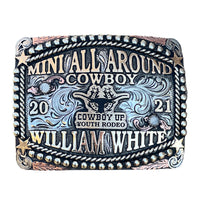 The Newark Buckle is a unique shaped silver plated buckle that looks awesome with its beautiful Bead and rope border. This custom trophy buckle has a very unique look, and the custom lettering can be changed to whatever you need. The shimmer of this buckle will catch your eye and is a great way to show off someone’s hard work, achievement, or personalization. This buckle measures 3.5" inches tall by 4.5" inches wide. The back of the buckle has a hook for your belt hole. It also has a swivel bar to attach to your belt.