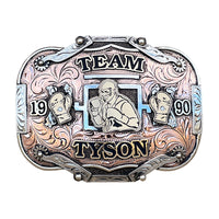 The Boxing Buckle is a unique shaped silver plated buckle that looks awesome with its logos in the center. This custom buckle has a very unique look, and the custom lettering can be changed to whatever you need. The shimmer of this buckle will catch your eye and is a great way to show off someone’s hard work, achievement, or personalization. This buckle measures 3.5" inches tall by 4.5" inches wide. The back of the buckle has a hook for your belt hole. It also has a swivel bar to attach to your belt.
