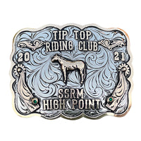 The Oakdale Belt Buckle is an antique silver plated buckle that looks awesome with the little spurs in the corners. This custom trophy buckle has a very unique look, and the custom lettering can be changed to whatever you need. The shimmer of this buckle will catch your eye and is a great way to show off someone’s hard work, achievement, or personalization. This buckle measures 3.5" inches tall by 4.5" inches wide. The back of the buckle has a hook for your belt hole. It also has a swivel bar to attach to your belt.