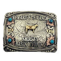 The Olive Belt Buckle is a square antique silver plated buckle that looks awesome with its turquoise stones. This custom trophy buckle has a very unique look, and the custom lettering can be changed to whatever you need. The shimmer of this buckle will catch your eye and is a great way to show off someone’s hard work, achievement, or personalization. This buckle measures 3.5" inches tall by 4.5" inches wide. The back of the buckle has a hook for your belt hole. It also has a swivel bar to attach to your belt.