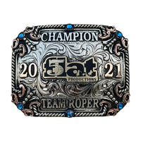 Belt buckles are a great way to advertise or show an achievement, or to personalize one for yourself. This buckle is only an example of how this buckle looks. Your buckle will be made to your specifications, lettering, stone color, etc. For example, if you see a team roper as a figurine and you would like a barrel racer, this will be changed to fit your needs. That goes for the lettering also; whatever lettering you see on the buckle is just an example and will be changed to the lettering you want.