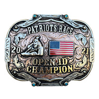 The Parker trophy belt buckle is based around spurs and turquoise The stone colors can be changed out to other colors if you would like., just tell us in our buckle customization form. The custom lettering can be changed to whatever you need as well. The design of this buckle is an eye catcher and is a great way to show off someone’s hard work, achievement, or personalization. This buckle measures 3.5" inches tall by 4.5" inches wide. The back of the buckle has a hook for your belt hole. It also has a swivel bar to attach to your belt.