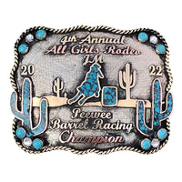 The Payson Buckle is a unique shaped silver plated buckle that looks awesome with its beautiful border. This custom trophy buckle has a very unique look, and the custom lettering can be changed to whatever you need. The shimmer of this buckle will catch your eye and is a great way to show off someone’s hard work, achievement, or personalization. This buckle measures 3.5" inches tall by 4.5" inches wide. The back of the buckle has a hook for your belt hole. It also has a swivel bar to attach to your belt.