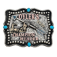 Belt buckles are a great way to advertise or show an achievement, or to personalize one for yourself. This buckle is only an example of how this buckle looks. Your buckle will be made to your specifications, lettering, stone color, etc. For example, if you see a team roper as a figurine and you would like a barrel racer, this will be changed to fit your needs. That goes for the lettering also; whatever lettering you see on the buckle is just an example and will be changed to the lettering you want.