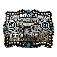 The Perry Buckle is a unique antique engraved and silver plated buckle that looks awesome with its cool border around the edge. This custom trophy buckle has a very unique look, and the custom lettering can be changed to whatever you need. The shimmer of this buckle will catch your eye and is a great way to show off someone’s hard work, achievement, or personalization. This buckle measures 3.5" inches tall by 4.5" inches wide. The back of the buckle has a hook for your belt hole. It also has a swivel bar to attach to your belt.