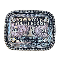 The Pinetop Buckle is a unique shaped silver plated buckle that looks awesome with its beautiful filigree and letters. This custom trophy buckle has a very unique look, and the custom lettering can be changed to whatever you need. The shimmer of this buckle will catch your eye and is a great way to show off someone’s hard work, achievement, or personalization. This buckle measures 3.5" inches tall by 4.5" inches wide. The back of the buckle has a hook for your belt hole. It also has a swivel bar to attach to your belt.