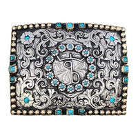 The Piqua Buckle is an antique German silver buckle with a new take on some of the original cowboy belt buckles. This custom  buckle has a very unique look, and the custom lettering can be changed to whatever you need. The traditional look of this buckle will catch your eye and is a great way to show off someone’s hard work, achievement, or personalization. This buckle measures 3.5" inches tall by 4.5" inches wide. The back of the buckle has a hook for your belt hole. It also has a swivel bar to attach to your belt.