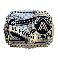 The Potro Buckle is a square silver plated buckle that looks awesome with its accents of baseball. This custom buckle has a very unique look, and the custom lettering can be changed to whatever you need. The shimmer of this buckle will catch your eye and is a great way to show off someone’s hard work, achievement, or personalization. This buckle measures 3.5" inches tall by 4.5" inches wide. The back of the buckle has a hook for your belt hole. It also has a swivel bar to attach to your belt.