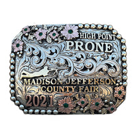 The Prone Buckle is a unique shaped silver plated buckle that looks awesome with its logos in the center. This custom buckle has a very unique look, and the custom lettering can be changed to whatever you need. The shimmer of this buckle will catch your eye and is a great way to show off someone’s hard work, achievement, or personalization. This buckle measures 3.5" inches tall by 4.5" inches wide. The back of the buckle has a hook for your belt hole. It also has a swivel bar to attach to your belt.
