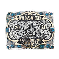 The Radium Buckle is a unique shaped silver plated buckle that looks awesome with its beautiful border. This custom trophy buckle has a very unique look, and the custom lettering can be changed to whatever you need. The shimmer of this buckle will catch your eye and is a great way to show off someone’s hard work, achievement, or personalization. This buckle measures 3.5" inches tall by 4.5" inches wide. The back of the buckle has a hook for your belt hole. It also has a swivel bar to attach to your belt.