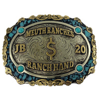 The Ranch belt buckle is a circular antique silver plated buckle designed to present your brand or logo. This custom buckle has a very unique look, and the custom lettering can be changed to whatever you need. Your lettering and brands will catch your eye and make this buckle a great choice to show off your hard work, achievement, or personalization. This buckle measures 3.5" inches tall by 4.5" inches wide. The back of the buckle has a hook for your belt hole. It also has a swivel bar to attach to your belt.
