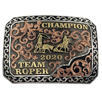 The Redding Buckle is an antique silver plated buckle with rose gold filigree and a really cool border. This custom trophy buckle has a very unique look, and the custom lettering can be changed to whatever you need. The shimmer of this buckle will catch your eye and is a great way to show off someone’s hard work, achievement, or personalization. This buckle measures 3.5" inches tall by 4.5" inches wide. The back of the buckle has a hook for your belt hole. It also has a swivel bar to attach to your belt.
