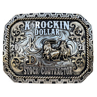 The Roadway trophy belt buckle is a square shaped silver and gold plated buckle designed to fit a belt perfect. This custom trophy buckle has a very unique look, and the custom lettering can be changed to whatever you need. The engraving will catch your eye and is a great way to show off someone’s hard work, achievement, or personalization. This buckle measures 3.5" inches tall by 4.5" inches wide. The back of the buckle has a hook for your belt hole. It also has a swivel bar to attach to your belt.