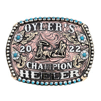 The ROCKVILLE Buckle is a unique shaped Copper plated buckle that looks awesome with its beautiful Bead and rope border. This custom trophy buckle has a very unique look, and the custom lettering can be changed to whatever you need. The shimmer of this buckle will catch your eye and is a great way to show off someone’s hard work, achievement, or personalization. This buckle measures 3.5" inches tall by 4.5" inches wide. The back of the buckle has a hook for your belt hole. It also has a swivel bar to attach to your belt.