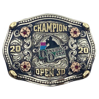 The Sacramento buckle has both and antique silver and shiny silver background mixed into one buckle. This custom trophy buckle has a very unique way to show off the lettering all while having a great overall look when on your belt. The traditional buckle has gold overlay lettering as a great contrast to make the custom buckle lettering visible. This buckle measures 3.5" inches tall by 4.5" inches wide. The back of the buckle has a hook for your belt hole and swivel bar.