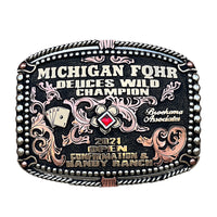 The Greenwood Buckle is a unique shaped silver plated buckle that looks awesome with its beautiful border. This custom trophy buckle has a very unique look, and the custom lettering can be changed to whatever you need. The shimmer of this buckle will catch your eye and is a great way to show off someone’s hard work, achievement, or personalization. This buckle measures 3.5" inches tall by 4.5" inches wide. The back of the buckle has a hook for your belt hole. It also has a swivel bar to attach to your belt.
