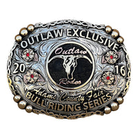 The Safford Buckle is a unique shaped silver plated buckle that looks awesome with its beautiful border. This custom trophy buckle has a very unique look, and the custom lettering can be changed to whatever you need. The shimmer of this buckle will catch your eye and is a great way to show off someone’s hard work, achievement, or personalization. This buckle measures 3.5" inches tall by 4.5" inches wide. The back of the buckle has a hook for your belt hole. It also has a swivel bar to attach to your belt.