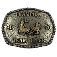 Belt buckles are a great way to advertise or show an achievement, or to personalize one for yourself. This buckle is only an example of how this buckle looks. Your buckle will be made to your specifications, lettering, stone color, etc. For example, if you see a team roper as a figurine and you would like a barrel racer, this will be changed to fit your needs. That goes for the lettering also; whatever lettering you see on the buckle is just an example and will be changed to the lettering you want.