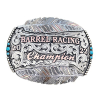 The Sartell Buckle is a unique shaped Silver plated buckle that looks awesome with its beautiful Bead and rope border. This custom trophy buckle has a very unique look, and the custom lettering can be changed to whatever you need. The shimmer of this buckle will catch your eye and is a great way to show off someone’s hard work, achievement, or personalization. This buckle measures 3.5" inches tall by 4.5" inches wide. The back of the buckle has a hook for your belt hole. It also has a swivel bar to attach to your belt.