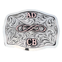 The Savannah Buckle is an antique German silver buckle with a new take on some of the original cowboy belt buckles. This custom trophy buckle has a very unique look, and the custom brand can be changed to whatever you need. The traditional look of this buckle will catch your eye and is a great way to show off someone’s hard work, achievement, or personalization. This buckle measures 3.5" inches tall by 4.5" inches wide. The back of the buckle has a hook for your belt hole. It also has a swivel bar to attach to your belt.