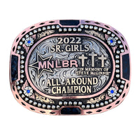 The Searcy Buckle is a unique shaped silver plated buckle that looks awesome with its beautiful border. This custom trophy buckle has a very unique look, and the custom lettering can be changed to whatever you need. The shimmer of this buckle will catch your eye and is a great way to show off someone’s hard work, achievement, or personalization. This buckle measures 3.5" inches tall by 4.5" inches wide. The back of the buckle has a hook for your belt hole. It also has a swivel bar to attach to your belt.
