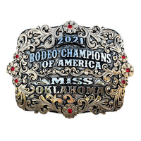 The Selma Buckle is a unique shaped silver plated buckle that looks awesome with its beautiful border. This custom trophy buckle has a very unique look, and the custom lettering can be changed to whatever you need. The shimmer of this buckle will catch your eye and is a great way to show off someone’s hard work, achievement, or personalization. This buckle measures 3.5" inches tall by 4.5" inches wide. The back of the buckle has a hook for your belt hole. It also has a swivel bar to attach to your belt.