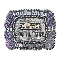 The Shawnee trophy belt buckle is based around our signature "Crushed Stones" stone design. The crushed stones on this western buckle looks great on your belt. The stone colors can be changed out to other colors if you would like, just tell us in our buckle customization form. The custom lettering can be changed to whatever you need as well. The design of this buckle is an eye catcher and is a great way to show off someone’s hard work, achievement, or personalization. This buckle measures 3.5" inches tall by 4.5" inches wide. The back of the buckle has a hook for your belt hole. It also has a swivel bar to attach to your belt.