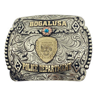The Sherriff is a Square silver plated buckle that looks awesome with the sheriff badge in the middle. We can change this out to your badge no problem. This custom trophy buckle has a very unique look, and the custom lettering can be changed to whatever you need. The shimmer of this buckle will catch your eye and is a great way to show off someone’s hard work, achievement, or personalization. This buckle measures 3.5" inches tall by 4.5" inches wide. The back of the buckle has a hook for your belt hole. It also has a swivel bar to attach to your belt.