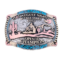 The Brewton Buckle is a unique shaped silver plated buckle that looks awesome with its beautiful border. This custom trophy buckle has a very unique look, and the custom lettering can be changed to whatever you need. The shimmer of this buckle will catch your eye and is a great way to show off someone’s hard work, achievement, or personalization. This buckle measures 3.5" inches tall by 4.5" inches wide. The back of the buckle has a hook for your belt hole. It also has a swivel bar to attach to your belt.
