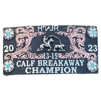 Belt buckles are a great way to advertise or show an achievement, or to personalize one for yourself. This buckle is only an example of how this buckle looks. Your buckle will be made to your specifications, lettering, stone color, etc. For example, if you see a team roper as a figurine and you would like a barrel racer, this will be changed to fit your needs. That goes for the lettering also; whatever lettering you see on the buckle is just an example and will be changed to the lettering you want.