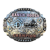 The Stagecoach Buckle is a square silver plated buckle that looks awesome with its silver and rose gold mixture. This custom trophy buckle has a very unique look, and the custom lettering can be changed to whatever you need. The shimmer of this buckle will catch your eye and is a great way to show off someone’s hard work, achievement, or personalization. This buckle measures 3.5" inches tall by 4.5" inches wide. The back of the buckle has a hook for your belt hole. It also has a swivel bar to attach to your belt.