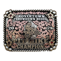 The Motocross Sport Buckle is a really cool buckle as we incorporate anything to make your buckle or prizeline superb. This custom trophy buckle has a very unique look, and the custom lettering can be changed to whatever you need. The shimmer of this buckle will catch your eye and is a great way to show off someone’s hard work, achievement, or personalization. The back of the buckle has a hook for your belt hole. It also has a swivel bar to attach to your belt.