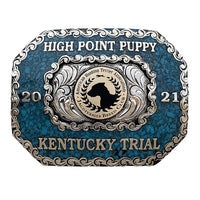 The Terrier Buckle is a unique shaped silver plated buckle that looks awesome with its crushed stone border. This custom buckle has a very unique look, and the custom lettering can be changed to whatever you need. The shimmer of this buckle will catch your eye and is a great way to show off someone’s hard work, achievement, or personalization. This buckle measures 3.5" inches tall by 4.5" inches wide. The back of the buckle has a hook for your belt hole. It also has a swivel bar to attach to your belt.
