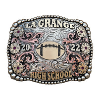 The Texas Graduation Buckle is a unique shaped silver plated buckle that looks awesome with its accents, figurines, and accomplishments expressed in the wording. This custom buckle has a very unique look, and the custom lettering, and figurines can be changed to whatever you need. The shimmer of this buckle will catch your eye and is a great way to show off someone’s hard work, achievement, or personalization. This buckle measures 3.5" inches tall by 4.5" inches wide normally but we have different sizes available. The back of the buckle has a hook for your belt hole. It also has a swivel bar to attach to your belt.