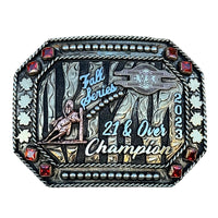 The troy Buckle is a unique shaped Silver plated buckle that looks awesome with its beautiful Bead and rope border. This custom trophy buckle has a very unique look, and the custom lettering can be changed to whatever you need. The shimmer of this buckle will catch your eye and is a great way to show off someone’s hard work, achievement, or personalization. This buckle measures 3.5" inches tall by 4.5" inches wide. The back of the buckle has a hook for your belt hole. It also has a swivel bar to attach to your belt.