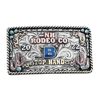TheTulare trophy belt buckle is a rectangular antique silver plated buckle designed to fit a belt perfect. This custom trophy buckle has a very unique look, and the custom lettering can be changed to whatever you need. The box buckle will catch your eye and is a great way to show off someone’s hard work, achievement, or personalization. This buckle measures 2" inches tall by 4" inches wide. The back of the buckle has a hook for your belt hole. It also has a swivel bar to attach to your belt.