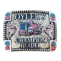 The Turlock Buckle is a unique shaped silver plated buckle that looks awesome with its beautiful feathers along the side. This custom trophy buckle has a very unique look, and the custom lettering can be changed to whatever you need. The shimmer of this buckle will catch your eye and is a great way to show off someone’s hard work, achievement, or personalization. This buckle measures 3.5" inches tall by 4.5" inches wide. The back of the buckle has a hook for your belt hole. It also has a swivel bar to attach to your belt.