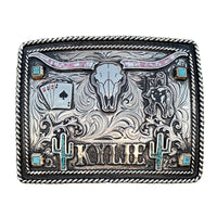 Belt buckles are a great way to advertise or show an achievement, or to personalize one for yourself. This buckle is only an example of how this buckle looks. Your buckle will be made to your specifications, lettering, stone color, etc. For example, if you see a team roper as a figurine and you would like a barrel racer, this will be changed to fit your needs. That goes for the lettering also; whatever lettering you see on the buckle is just an example and will be changed to the lettering you want.