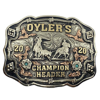 Belt buckles are a great way to advertise or show an achievement, or to personalize one for yourself. This buckle is only an example of how this buckle looks. Your buckle will be made to your specifications, lettering, stone color, etc. For example, if you see a team roper as a figurine and you would like a barrel racer, this will be changed to fit your needs. That goes for the lettering also; whatever lettering you see on the buckle is just an example and will be changed to the lettering you want.